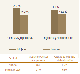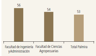 En esta Sede, ambas facultades registran un índice de feminidad superior al total de este centro de estudios, el cual es de 53 mujeres por cada 100 hombres (figura 16); en Ciencias Agropecuarias el índice es de 54 y en Ingeniería y Administración de 56. Esta última Facultad representa el 63 % del total de la matrícula en Palmira con algo más de 1 500 estudiantes.