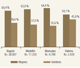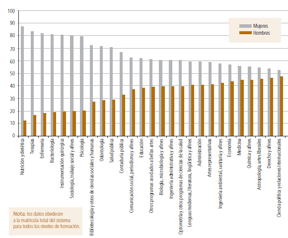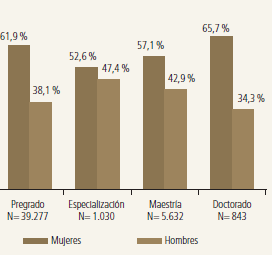 A pesar de los cambios y avances en favor de las mujeres en los indicadores sociales, la balanza sigue siendo desigual, inequitativa y discriminatoria en Colombia (Quintero y Peña, 2011). Si bien la tasa de graduados de la educación superior entre el 2001 y el 2010 es mayor en las mujeres (54,4 %) en comparación con los hombres (45,6 %), esto se presenta principalmente en las formaciones de tipo universitaria y de posgrados. No obstante, en la formación de tipo técnica y tecnológica se presenta una mayor tasa de graduación para los hombres (60 % y 51 %, respectivamente) (MEN, 2011).
