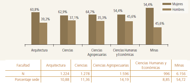Al hacer una descripción de la distribución entre hombres y mujeres en la matrícula estudiantil según el nivel educativo, se puede observar que tanto en pregrado como en posgrado se mantiene la mayor proporción de hombres. Cabe recordar que del total de la matrícula estudiantil en la UNAL para el 2010, el pregrado representa el 83 % y el posgrado el 17 %. Así, para el total de las sedes analizadas hay 62 % de hombres y 38 % de mujeres en el nivel de pregrado. En el posgrado estas proporciones presentan cambios, por lo que se registra un 57 % para los hombres y un 43 % para las mujeres.