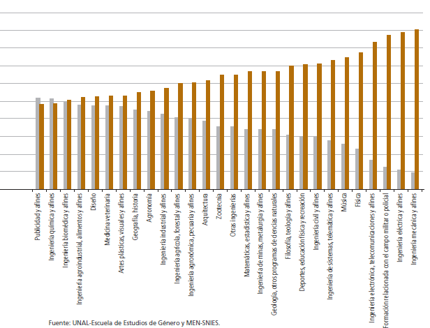 No obstante, el país se sigue ubicando en niveles medios según lo muestran los indicadores sectoriales para el contexto latinoamericano (Orealc-Unesco, 2013). En ese sentido, se mantienen procesos sociales que permiten la reproducción de algunas desigualdades, como es el caso de la segregación horizontal por áreas de conocimiento, el aumento de la brecha salarial que afecta principalmente a las mujeres con mayor formación, así como las desigualdades que afectan diferencialmente a determinados tipos de mujeres en comparación con otras, en razón de la condición de clase social, grupo étnico u otra condición social.