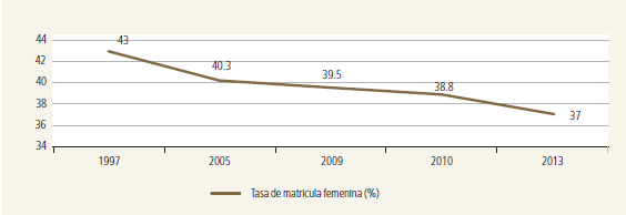 durante los últimos años la participación de las mujeres en la matrícula de la UNAL se ha situado por debajo del promedio nacional. Mientras en 1997 las mujeres representaban algo más del 40 % de la matrícula en esta Universidad, en el 2013 esta cifra había descendido al 37 % (figura 2).