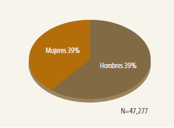 El total de estudiantes matriculados de la UNAL en el 2010 fue de 47.277 en el primer semestre académico, y de 46.832 en el segundo. Estas cifras corresponden al total de las 4 “sedes andinas”5 para todos los niveles de formación, correspondiente al 99 % del total de estudiantes en la Universidad. De ese total de estudiantes, la proporción de hombres y mujeres fue similar en los 2 semestres, siendo mayoritarios los hombres sobre las mujeres en una tasa superior al 60 % (figura 3).