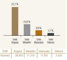 Antes de entrar a observar el comportamiento de la matrícula estudiantil y sus diferencias por sexo en cada una de las sedes, es necesario identificar cuál es el tamaño y proporción de cada una de éstas en el conjunto de la Universidad. En ese sentido, se destaca que un poco más del 60 % de la población estudiantil de la UNAL se concentra en la Sede Bogotá, luego sigue la Sede Medellín en una proporción cercana al 25 %, después la Sede Manizales y finalmente la de Palmira (figura 5).