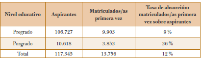 En ese mismo sentido, la tasa de absorción se ha reducido ante el aumento de la demanda por cupos, y las mujeres han resultado excluidas en mayor proporción que los hombres. Por ejemplo, en el 2005 la participación femenina entre los aspirantes a ingresar a la Sede Bogotá fue del 53 %, pero las mujeres sólo representaron el 39 % de los admitidos. Así pues, la tasa de absorción masculina (aspirantes/admitidos) (9,2 %) casi duplica a la femenina (5,3 %) (Arango y Quintero, 2013).
