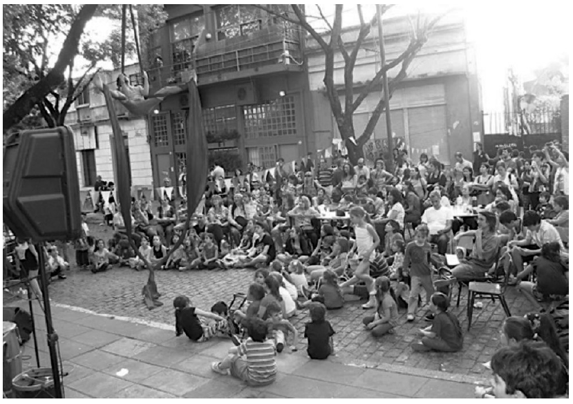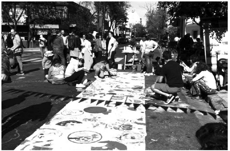 Asimismo, la calle se transforma en escenario vivo de una producción artística, lúdica, cultural y educativa. Al igual que en las dos experiencias anteriores, la calle se convierte en espacio privilegiado de sociabilidad, construcción de identidad, enunciación y visibilidad. Cada uno de estos eventos se realiza como obra estética y performática. Tan importante como las actividades que ocurrirán son las acciones de diseño del espacio y el tiempo (dónde ubicar qué actividad, en relación a cuál otra y en qué secuencia). Éstas son acciones estéticas compositivas que precisan tomar en cuenta aspectos técnicos (espacio, tiempo, sonido, color, objetos) y perceptivos (¿qué percibirán los participantes del evento?).