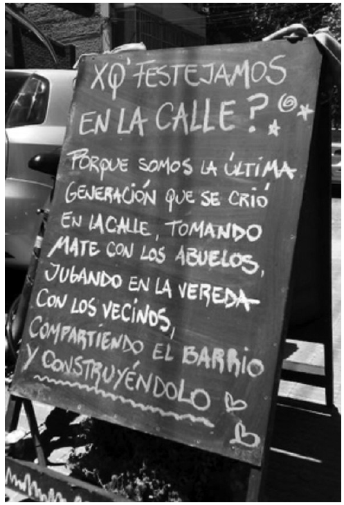 El barrio es una noción que se construye en forma compartida a través del afecto (dos corazones lo acompañan gráficamente). En la tablilla que une las patas de la pizarra hay un garabato verde, tan cerca del suelo que parece la representación gráfica de referencia del aire libre, lo orgánico, la naturaleza y la productividad de la tierra. Como ya analizamos en secciones anteriores, las organizaciones del MTA tienen una valorización de la vida saludable y de la naturaleza.