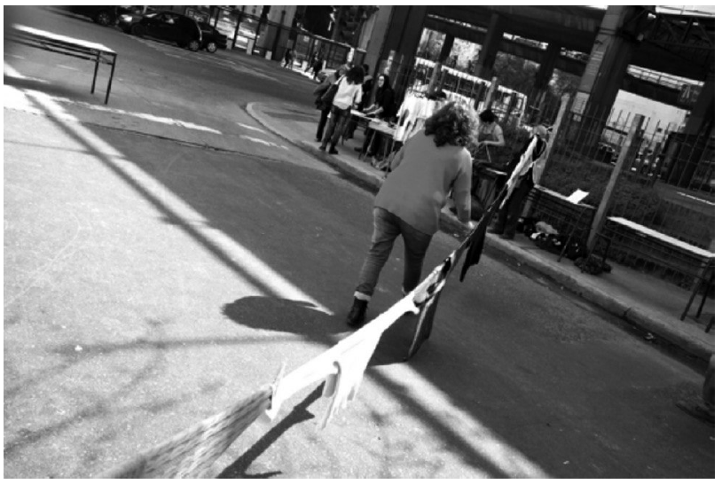 Se crea así una intervención con función simbólica: representa cuerpos de quienes están y no están. Este tipo de expresión es una práctica de los organismos de derechos humanos en Argentina (uso de siluetas para visibilizar los asesinatos). Las prendas de ropa unen la memoria histórica (lucha por los derechos humanos) con una noción de presencia de cuerpos entrelazados que aquí simbolizan comunidad y otorgan visibilidad a cuerpos ausentes. En otros momentos en el CEIA se habían usado estos tipos de intervenciones para recordar que en los contextos de vida habituales de sus estudiantes es frecuente ausentarse de la escuela por distintas razones -por situaciones de vida precarias y/o persecución por parte de la policía- (registros de abril a junio del 2014 y mayo del 2016).
