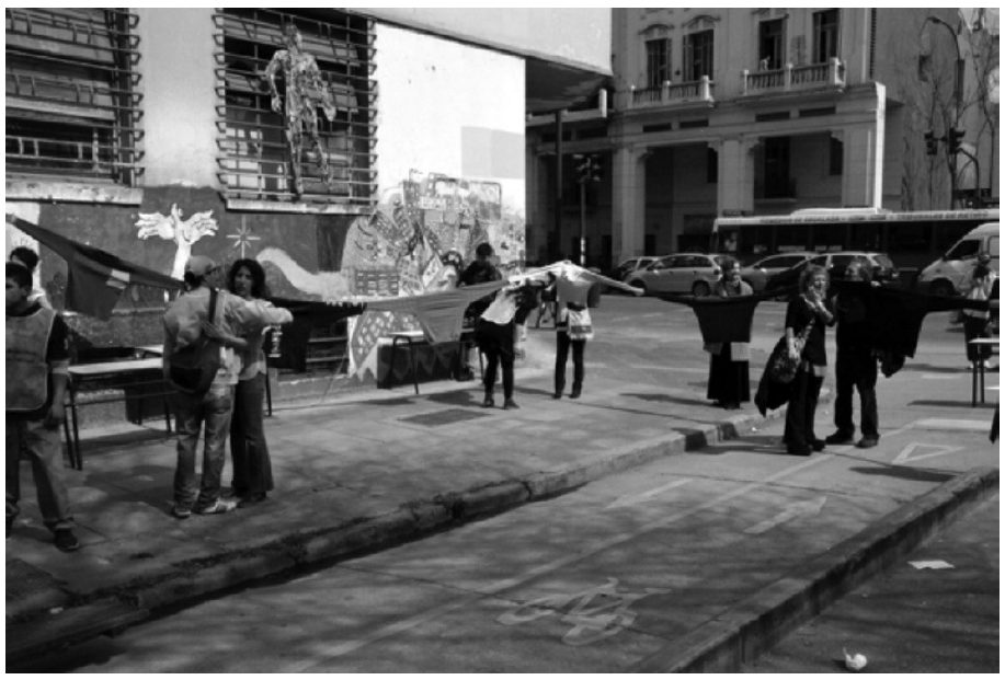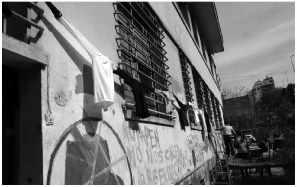 Propiedad, disponibilidad, recursos. Para profundizar nuestro análisis sobre las prácticas y sentidos vinculados a la propiedad hemos analizado fotografías y videograbaciones de la reinauguración del edificio del CEIA (9 de septiembre del 2016) (imágenes 4 y 5). Luego de una inversión de 14 millones de pesos, el Gobierno de la ciudad anunció que demolería el edificio porque cambiaría la traza urbana de esa parte de la ciudad. La intervención callejera tuvo un doble objetivo: celebrar la prolongada lucha (2011-2016) por mejoras en la edificación y alertar a la sociedad sobre el anuncio de la demolición. Este acontecimiento contó con el apoyo de otras organizaciones vecinas geográfica e ideológicamente. En el registro audiovisual se observa la llegada de las personas al evento. Se ve a algunos participantes atando prendas de ropa, de forma que logran rodear el edificio de la escuela, a modo de abrazo (imagen 6).