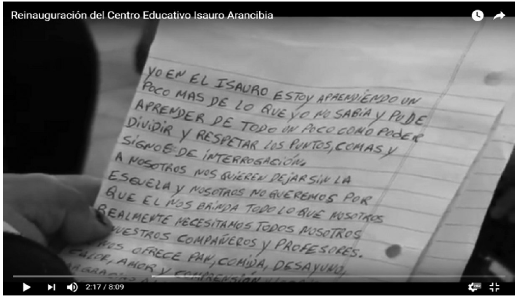 El registro visual permite ver y oír la confluencia de dos aspectos de esta jornada: celebrar (la existencia del Centro, el edificio, la presencia de amigos y vecinos) y protestar (advertir acerca de la amenaza de derribar el edificio). Se ve una gran cantidad de estudiantes y docentes del CEIA con una pechera donde se lee "Isauro Arancibia, amor, tiza y libertad". Estas palabras sintetizan tres funciones: contención y sostén emocional de los jóvenes (amor), enseñar y aprender (tiza) y finalmente educar para la libertad. El propósito final del Centro es que los estudiantes reflexionen y decidan sobre sus vidas. La acción político-cultural que analizamos pone el eje de la discusión en la necesidad de respeto por la dignidad de las vidas de los jóvenes, atravesados por la violencia social e institucional. Frente a la amenaza de demolición, la comunidad del Centro, los amigos y vecinos confrontan con una pasión alegre: celebran la remodelación de su edificio, de su lugar. Para concluir, presentamos las palabras que leyó una joven a través de la siguiente fotografía (imagen 7):