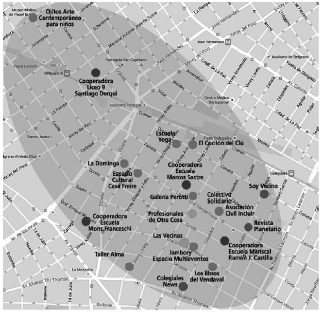 Un mapa de múltiples nodos (imagen 8). A partir de algunas primeras experiencias, vinculadas con actividades artísticas, se expandió la noticia de que existía la iniciativa autoorganizada Circuito Cultural Marcos8 en Colegiales. Comenzó con dos nodos y durante el 2015 se incorporaron doce más; actualmente tiene veinte nodos estables y algunos que se suman a medida que se realizan actividades, sea ocasionalmente para dicha actividad o agregándose a las reuniones mensuales operativas del Circuito. Nodo fue el término que se le dio a cada punto que se incluía, sin importar si se trataba de una organización, grupo o persona, ya que el requisito para participar es ofrecer recursos (conocimientos, trabajo voluntario, locales, andamiaje institucional, entre otros).