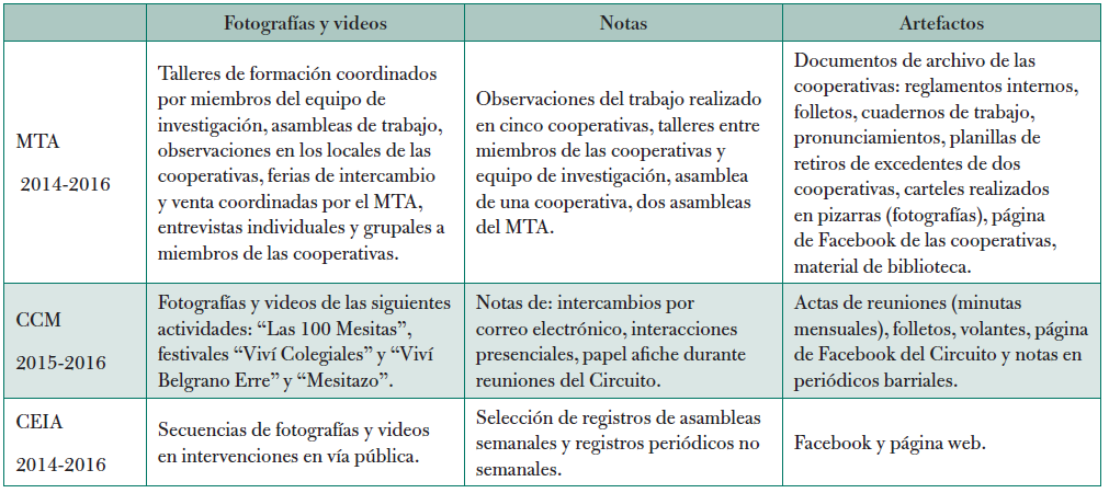 Reconociendo así que la posibilidad de innovación se aloja en el quehacer de los grupos y sus capacidades instituyentes, en este trabajo analizamos el quehacer de una red de cooperativas de trabajo -Movimiento de Trabajadores Autogestionados de Rosario (MTA)-, una escuela autogestionada -Centro Educativo Isauro Arancibia (CEIA)- y un circuito cultural autoconvocado -Circuito Cultural Marcos-. El MTA es un colectivo creado en el 2014 para compartir saberes y experiencias, brindar herramientas y superar obstáculos en cada cooperativa. En el momento de este análisis nucleaba ocho cooperativas: un lavadero industrial, dos almacenes naturistas, un delivery y restaurante vegetariano, un emprendimiento que produce cerveza artesanal, otro que produce medallones de legumbres, un bar y centro cultural y una cooperativa de contadores. Sus integrantes lo ven como un espacio de participación autoorganizado donde "hay otra forma de organizarse, de trabajar... y de cambiar incluso esas formas miles de veces" (trabajador Movimiento Cajonardi, entrevista 28 de agosto del 2015). Previamente, algunas cooperativas participaron del Encuentro Amplio Nacional de Cooperativas Autogestionadas; para lograr un trabajo "más territorial y concreto con las cooperativas de Rosario" decidieron crear el MTA (trabajador Sattva, entrevista 16 de junio del 2015). Al principio, realizaban reuniones para compartir experiencias. A medida que se iban sumando otras cooperativas, pusieron en marcha ferias para vender sus productos, jornadas de video-debate y talleres para brindar formación en distintos aspectos: cuestiones administrativas y productivas, comunicación de la impronta social-solidaria y mecanismos para debatir y generar acuerdos. Por su parte, la segunda experiencia analizada, el CEIA, fue originalmente creado como escuela para adultos en 1998. Está ubicado en la zona sur de la Ciudad de Buenos Aires y recibe a personas en situación de calle (pernoctan en hoteles, ranchadas2 o en las estaciones de trenes y ómnibus cercanas al Centro). Dos organizaciones (la Asociación Mujeres Meretrices de la Argentina y el Movimiento de Ocupantes e Inquilinos) y una docente solicitaron abrir el CEIA para atender las necesidades de formación y contención de esta población (Heras y Miano, 2017). El CEIA fue generando una pedagogía específica para sus estudiantes que se basa en el respeto y la comprensión de la situación de calle como lógica vital (por ejemplo, las nociones de tiempo y espacio de los estudiantes a partir de prácticas de vida nómades). Además, su enfoque educativo se sustenta en un marco general del derecho a sostener la vida, tomando para ello nociones y posturas teórico-políticas del movimiento de derechos humanos de la Argentina. Los educadores del CEIA (maestros, artistas, médicos, trabajadores sociales y psicólogos) han constituido un dispositivo semanal (Asamblea de los Viernes) donde se toman las decisiones. Asimismo, conforman equipos de trabajo pequeños (por ciclo escolar, por proyecto o por área temática) que sostienen iniciativas educativas debatidas y avaladas por la Asamblea. Por último, la tercera experiencia es la del Circuito Cultural Marcos. Surgió en el 2015 en un barrio de la Ciudad de Buenos Aires a partir de la iniciativa de una asociación cooperadora que realizaba actividades extraescolares de carácter recreativo, educativo y artístico. A medida que las actividades se hicieron frecuentes, se volvió difícil obtener el permiso de las autoridades para el uso del edificio escolar. Así, el grupo de familias pensó en crear un centro cultural pero, a lo largo de los encuentros, a algunos se les ocurrió generar un circuito, ya que existe en el barrio una gran cantidad de grupos y organizaciones. Solamente era cuestión de vincularlos entre sí. Inicialmente se comenzó relacionando a la escuela con una asociación civil del barrio (donde participamos las autoras de este artículo, una de ellas también formaba parte de la Asociación Cooperadora). Pronto se unieron dos bandas de música y un restaurante que se dispuso a prestar su local en horarios en que no estaba abierto al público.