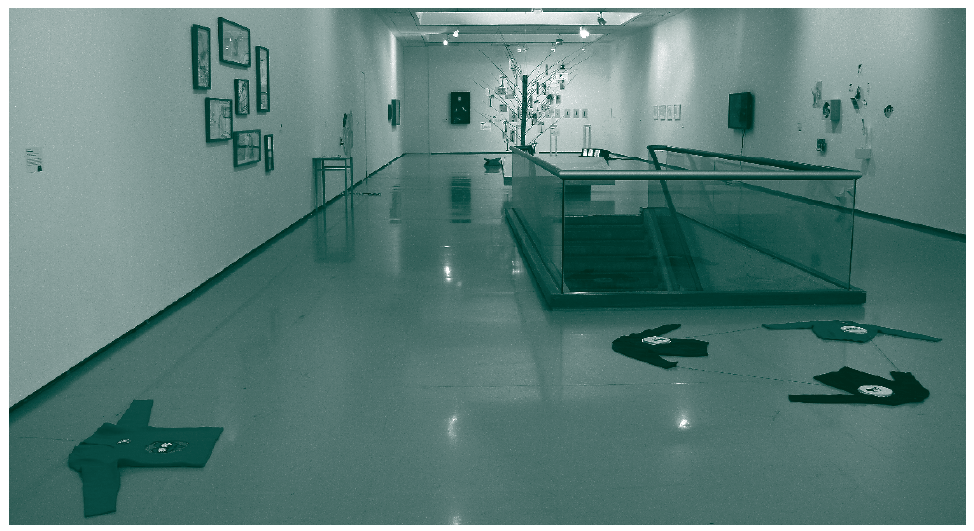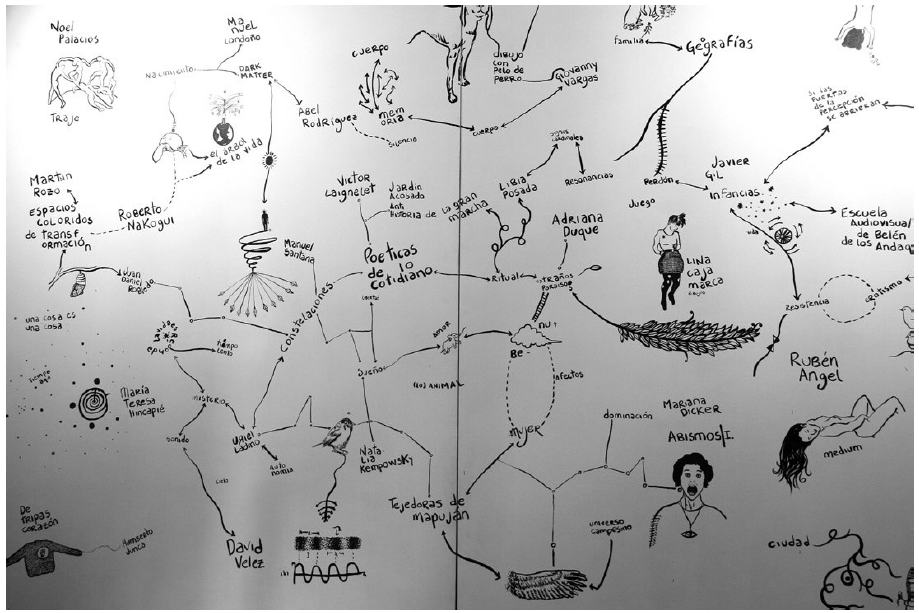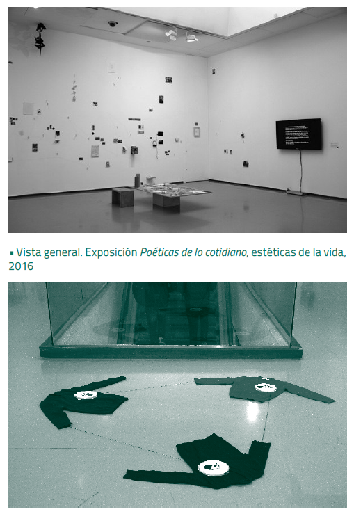 Las consideraciones anteriores nutrieron la realización de varias acciones: talleres, trabajos pedagógicos, una convocatoria abierta alrededor de gestos y momentos cotidianos, ciclo de cine y una exposición titulada "Poéticas de lo cotidiano, estéticas de la vida", celebrada en el Museo de la Universidad Jorge Tadeo Lozano en el mes de noviembre del 2016 (imagen 1). La exposición se asumió como parte de un dispositivo mayor en tanto que establecía conexiones, desterritorializaciones y encuentros más allá de la muestra. Más que un resultado acabado pretendía ser un detonador de ideas y pensamientos, no se reducía a obras del gran arte al dar cabida a producciones de diversa procedencia: de artistas, alumnos, de colectividades y de personas sin vínculos con el arte institucional. El sentido mismo de la muestra dejaba sin piso las divisiones de lo sensible que jerarquizan y diferencian las altas sensibilidades de aquéllas que no lo son (se incluyó una selección de gestos y acciones cotidianas derivados de la convocatoria realizada por el grupo para la ocasión). La muestra se planteó desde algunos ejes que, a pesar de presentarse separadamente, resuenan entre sí tanto en un plano conceptual como en la misma exposición. Éstos se presentan a continuación (imagen 2).