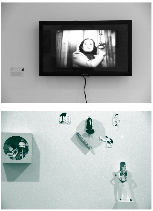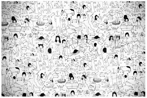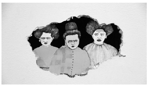 Desde esa lógica valorativa se ha histerizado el cuerpo y el deseo femenino. A lo largo de la historia de los discursos médicos de Occidente, el imaginario masculino construyó un discurso acerca de lo femenino caracterizando a la mujer desde contextos históricos marcados por su subordinación (Fernández, 1994). Se medicalizó el cuerpo y el deseo de las mujeres, en tanto se abordaba como anomalía todo aquello que escapara de una definición de su sexualidad como pasiva, frágil, dependiente y predestinada a la maternidad. En ese contexto, muchas expresiones femeninas de autodeterminación, erotismo y libertad fueron y han sido enjuiciadas y tratadas como histerias. El trabajo Abismos I, de Mariana Dicker (imagen 4), utilizando como mecanismo de creación el montaje de varios fragmentos de películas, muestra una serie desmayos y ataques "histéricos" que señalan la interiorización de ese imaginario por parte de la mujer. El montaje también muestra prácticas psiquiátricas que, legitimadas desde el discurso médico, sirvieron para objetivar, dominar y violentar el cuerpo femenino. Desde un lugar más humorístico, y a través de dibujos, Lina María Cajamarca (imagen 5) pone de manifiesto excesos, gesticulaciones y muecas, escenificando casi que teatralmente la cotidianidad de ciertas mujeres. Con la riqueza del dibujo hace visibles modelos de belleza y feminidad tan irónicos como grotescos.