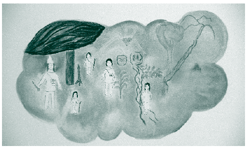 El dibujo y audio de Roberto Nakogui es un buen representante de toda esta concepción (imagen 6a). Nos entrega una visión de la comunidad en la que todo interexiste. Agua, tierra, árboles, animales construyen un gran tejido relacional amparado por una concepción del territorio distanciada de lo meramente físico. El territorio es algo vivo y definido por la interacción armónica de todas esas entidades, naturalmente la sacralidad es parte de esas resonancias y no una esfera aparte. En esa dirección se encamina también El árbol de la vida, de Abel Rodríguez (imagen 6b). El árbol se asume en su riqueza metafórica para hablar del lujo incesante de vida que circula desde la tierra hasta los cielos. Mediante bellos dibujos advertimos una cosmogonía que visibiliza las correspondencias y armonías establecidas entre el mundo natural y los seres humanos.