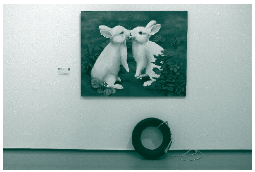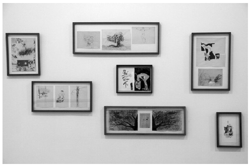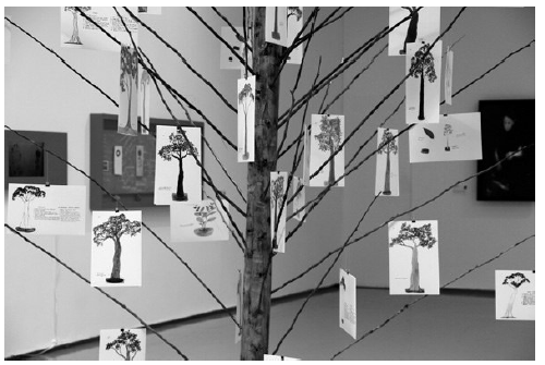 En buena parte la modernidad occidental definió lo humano desde su separación de lo animal. El lugar central y superior de lo humano configuró un antropocentrismo que jerarquizó y dicotomizó lo humano frente a lo animal. En la actualidad, y desde diversos frentes, se ha intentado repensar esas dicotomías y exclusiones: desde planteamientos que señalan las colaboraciones y coevoluciones establecidas entre hombre y animal, a partir de una suerte de biosocialidad, desde la continuidad de la vida que articula y correlaciona diversas especies, partiendo de una mutua constitución entre éstas (los otros conmigo). Como mencionábamos, al referirnos a las comunidades, se trata de abrir la noción de comunidad a entornos impersonales que trascienden al sujeto individual, donde el hombre se descentra y donde lo otro ya no se define por su supuesta inferioridad. La vida más que un acto de conciencia, o un objeto de conocimiento, se abre entonces a un continuo vital pleno de afectos, relaciones y reciprocidades. En esa dirección se presentaron diversos trabajos: una instalación sonora de David Vélez que muestra una comunidad sonora, una suerte de orquestación de sonidos naturales. Los dibujos con pelo de perro de Giovanni Vargas; la pintura e instalación de Juan Mejía (imagen 8a); las coloridas crisálidas de polillas de Marthín Rozo; los dibujos y pinturas de Rubén Ángel (imagen 8b), en los cuales animales, personas y naturaleza celebran un juego de íntimas y secretas relaciones; y en los videos de Manuel Londoño, donde todo adquiere una profundidad temporal llena de resonancias tan misteriosas como desconocidas.