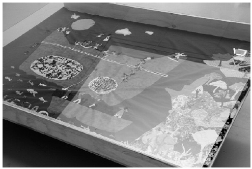 El trabajo de las tejedoras de Mampuján es un buen ejemplo de iniciativas comunitarias construidas alrededor de una expresión plástica (imagen 7a). La masacre de Mampuján en el 2000 impulsó a varias campesinas a ayudar a las comunidades de los Montes de María a rehacerse simbólicamente después de experimentar las masacres y el desplazamiento. A través de tejidos y tapices de extraordinaria riqueza visual hacen y deshacen relatos y memorias. Esta acción de resistencia pacífica fue merecedora del Premio Nacional de Paz. Desde otro lugar, el trabajo del artista Víctor Laignelet, Jardín acosado: anti-historia de la gran marcha (imagen 7b), se refiere a esa crisis de una comunidad unificada. Sus videos y dibujos interrogan la linealidad de un supuesto e ideal progreso. Apelando a diversos tiempos y referentes, tiende a mostrar las grietas de ese proyecto. A través de instantes y gestos cotidianos muestra cómo la espiritualidad y la vida fracturan el ideal de un creciente progreso.
