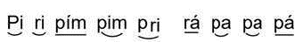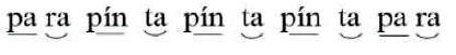 Nótese la secuencia de agrupamientos básicos que acentúan la primera sílaba de cada grupo de dos (señaladas con la línea recta inferior). En una aproximación al pentagrama, los acentos podrían percibirse así (encerradas en elipses rojas en la parte superior) (figura 5):