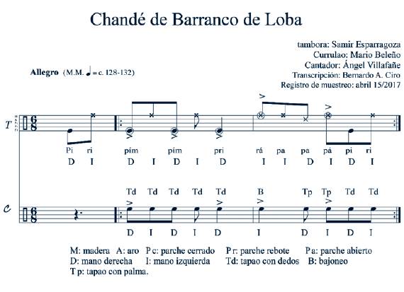 Podría decirse que, a excepción de Carbó, gran parte de los investigadores no han percibido la presencia de estos mecanismos de violencia simbólica que subyacen en los procesos de negociación cultural de los detentores del chandé con los festivales; en un panorama aún más detallado, quizá tampoco han reparado en las especificidades rítmicas presentes en el chandé de cada uno de los tres municipios. En la cartilla Pitos y tambores del Ministerio de Cultura (Valencia, 2004) queda esto en evidencia, allí se reprodujeron estructuras rítmicas unificadas del chandé lobano que afectaron los procesos de enseñanza-aprendizaje del chandé en otros lugares, convirtiéndose también en una forma de dominación simbólica por su acción homogeneizante e invisibilizadora, hecho que en la actualidad sigue suscitando intensos debates entre sus detentores. Para evidenciar esta acción homogeneizan-te de la cartilla, se utilizó la técnica de la observación participante, donde se definieron tres fases: en la primera, se ejecutó frente a los detentores las estructuras rítmicas del chandé en la tambora propuestas por la mencionada cartilla; en la segunda, se ejecutó in situ el ritmo de chandé con cada grupo, haciendo un registro de éstos en el diario de campo; y en la tercera, se realizó una conversación con todos los detentores lobanos alrededor de las especificidades rítmicas e históricas encontradas en cada ritmo de chandé.