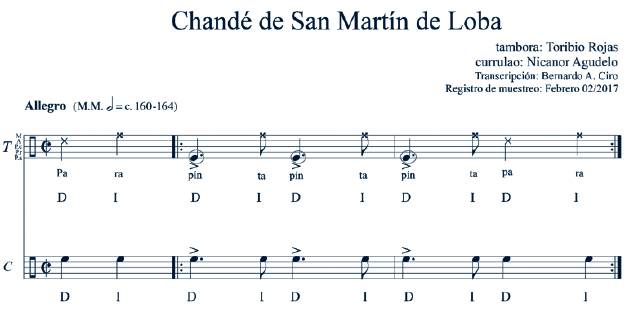 Por otro lado, la cartilla Pitos y tambores difundió dos esquemas del chandé que en la actualidad se han tomado como universales en los procesos de enseñanza-aprendizaje musical, sin señalar la existencia de investigaciones de campo y en qué territorios, o si se siguió la investigación de Carbó, puesto que éste último aclara que recorrió cinco de los aproximadamente veinte territorios donde se divulga el chandé (Carbó, 2003), además de realizar un importante análisis comparativo entre el ritmo de la guacherna de San Martín de Loba y el ritmo de chandé del municipio de Talaigua Viejo. En este orden de ideas, esta publicación, que fue regulada por el Estado, genera inquietudes sobre la existencia de mecanismos de dominación simbólica a través de la renovación de lo que Bourdieu define como "acción unificadora de la Cultura", donde, según el autor, "[...] el Estado contribuye a la unificación del mercado cultural, unificando todos los códigos [...] y llevando a cabo la homogeneización de las formas de comunicación [...]" (Bourdieu, 1997: 105), invisibilizando las divergencias e imponiendo en las academias de música una simplificación del chandé lobano (que se resiste a ser homogeneizado), yendo con ello en detrimento, tanto de las estrategias formuladas por la Política de Diversidad Cultural de Colombia, creada a partir de la Constitución Política de 199117, como de las prácticas musicales de tradición oral y sus significaciones, hecho que a su vez posiblemente ha sido "generalizado" y "canonizado" por el contexto académico que los escruta.