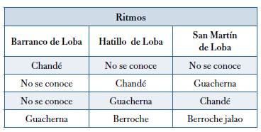 En este sentido, la figura 6 recoge esta comparación, aclarando que trata sólo el ritmo despojado de otras significaciones. Así, el chandé de Barranco de Loba es diferente, tanto al chandé de Hatillo de Loba, como al de San Martín de Loba. Por su parte, el chandé de Hatillo de Loba es lo que los detentores de San Martín de Loba llaman guacherna y los detentores de Barranco de Loba no reconocen. Más complejo resulta cuando la guacherna de Hatillo de Loba es lo que los detentores de San Martín de Loba llaman chandé, la guacherna de Barranco de Loba es lo que los detentores de Hatillo de Loba llaman berroche y lo que los detentores de San Martín de Loba llaman berroche jalao.
