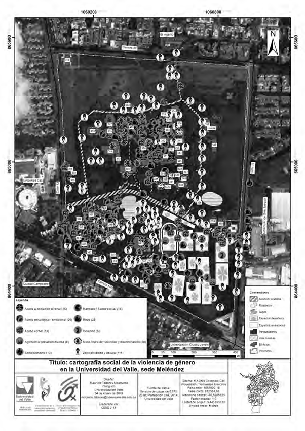 En el marco de la construcción de la Política de Género para la Universidad del Valle1, que inició en agosto del 20172, un grupo de profesoras, profesionales y estudiantes vinculadas al Centro de Investigaciones y Estudios de Género, Mujer y Sociedad (CIEGMS) realizamos un ejercicio de cartografía social en las sedes de Meléndez y San Fernando, en Cali, que buscaba complementar la información para visibilizar y sistematizar las experiencias y percepciones sobre violencias basadas en género que ocurren en estos campus.