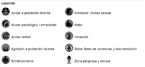 La cartografía en ambas sedes fue bien valorada, hubo receptividad y apertura para participar. Algunas personas se sintieron atraídas por los mapas y se acercaron para conocer la actividad. Paralelo a la ubicación del hecho en el mapa, narraron algunos sucesos y discutieron y aprovecharon para hacer consultas de carácter personal. Los íconos utilizados fueron los siguientes (figura 1).