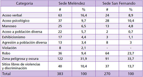 Los edificios, los senderos peatonales y las zonas circundantes al campus de San Fernando (avenidas públicas alrededor de la Universidad) son los entornos que más concentran las violencias basadas en género, y se han convertido en lugares de miedo, donde la práctica de desplazamiento muchas veces se vuelve topofóbica; las plazoletas y parqueaderos son los espacios donde menos se registraron casos de violencias.