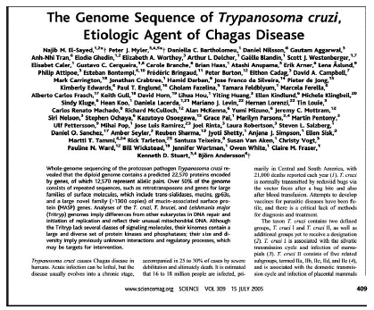 En los años siguientes a la publicación de esta secuencia completa, numerosos artículos avanzaron en diferentes cuestiones relativas con el genoma del T. cruzi, casi siempre comenzando con una descripción de la enfermedad de Chagas como problema público o de salud. Aunque la cantidad de artículos es gigantesca, haremos una breve selección de un puñado de ellos4. El biólogo argentino Martín Vázquez (2007) comenzó diciendo que el Trypanosoma cruzi es el causante de la enfermedad de Chagas en humanos, endémica en los países de América Latina, donde hay de 16 a 18 millones de personas afectadas, con más de 20.000 reportadas por año". Y hacia el final de su investigación, formuló la promesa: