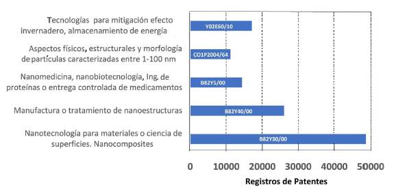 Se obtuvieron otras correlaciones entre oferta nanotecnológica patentada, compañías y productos para las áreas de la nanomedicina, tecnologías para mitigación del efecto invernadero (sección Y) y aspectos físicos y estructurales de nanopartículas (sección C). Cabe resaltar la importancia de esta última área como base tecnológica para fortalecer las acciones de regulación, normalización (ISO, 2017) y elaboración de definiciones consensuadas sobre nanomateriales (Camacho et al., 2016), aspecto esencial para la cooperación y la formulación de políticas globales de gobernanza, manejo y gestión responsable de materiales nanoestructurados.