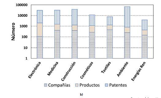 De acuerdo con la CPC (Cooperative Patent Clasification)3, y producto de la búsqueda de las secciones con mayor número de registros de patentes, se obtuvieron los resultados que se muestran en la figura 1a, en la cual la sección B, que califica la realización de operaciones y transporte, incluye la clasificación con código B82 correspondiente a nanotecnología. El mayor número de registros aparece para el código B82Y30/00, el cual pertenece a nanotecnología para materiales o ciencia de superficies, por ejemplo, nanocomposites. Una clara correlación para esta línea de oferta tecnológica la constituyen la variedad y el número de recubrimientos para decoración, albañilería y estructuras que ya se ofrecen en el mercado, así como el número de compañías que los comercializan, tal como lo indica la figura 1b para el área de la construcción.