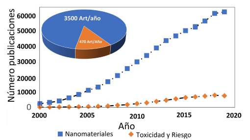 Como se puede observar, la investigación en toxicidad y riesgo es incipiente respecto a la oferta de materiales nanoestructurados y procesos con potenciales usos. Mientras que la tasa media de crecimiento en productividad científica sobre toxicidad y riesgo alcanza los 470 artículos/año, en nanomateriales se registra una tasa media de crecimiento de 3.500 artículos/año. Estas cifras ratifican que los posibles causales de riesgo por el uso de nanomateriales pertenecientes a la creciente y amplia oferta gestada desde la investigación, no son aun suficientemente conocidas para proporcionar criterios de selección de la voluminosa oferta disponible y la posterior adopción segura de tecnologías basadas en estos nanomateriales.