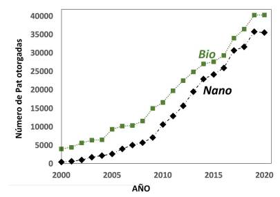 Se puede hacer una evaluación del cumplimiento de las expectativas para la línea de convergencia nanotech, a partir de la vigilancia tecnológica, para el periodo 2000-2020, específicamente con referencia a patentes otorgadas, productos disponibles en el mercado y compañías, lo que puede proporcionar información valiosa para valorar los alcances y el impacto tecnológico y económico (Qu et al., 2017). De acuerdo con los resultados obtenidos, se registra una tasa media de crecimiento de patentamiento global en nanotecnología para el periodo de 1900 patentes por año, con un número total de patentes otorgadas de 192.319. Estados Unidos es el país con mayor jurisdicción. Este incremento en innovación tecnológica puede asociarse con la generación de expectativas que produce una tecnología emergente basada en materiales, las cuales motivan inversión y desarrollo, tal como se previó en las visiones Nanol y Nano2.