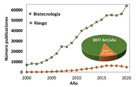 El número de investigaciones sobre riesgo, por ejemplo, en organismos modificados genéticamente para agricultura y alimentación (Spendeler, 2005), aunque todavía insuficiente, se ha incrementado significativamente en la última década. Del estudio de vigilancia tecnológica realizado para el periodo 2000-2020, se puede apreciar una tasa media de crecimiento de productividad científica en biotecnología de 3.077 artículos por año, mientras que la productividad en riesgo alcanza una tasa media de crecimiento de 355 artículos por año, tal como se muestra en la figura 4. Estas cifras resultan similares a las obtenidas para el caso de los nanomateriales.
