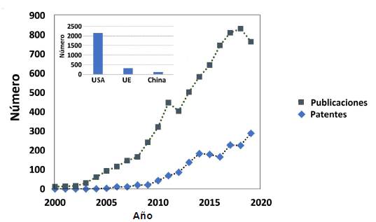 Una vigilancia tecnológica para la nanobiotecnología (figura 5) muestra una tasa anual de crecimiento de 150 patentes concedidas, con Estados Unidos como el país de mayor jurisdicción, seguido de la Unión Europea y China. En producción científica, la tasa media de crecimiento es de 15 artículos por año. Como es de esperarse, esta convergencia aún no muestra los mismos valores de crecimiento que acompañan a cada una de las líneas bio y nano individuales. Se trata de una oferta transversal que aún se encuentra en una fase de lanzamiento, de acuerdo con el ciclo de Gartner.
