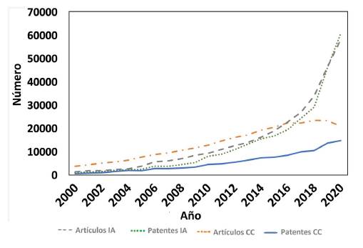 Si se determina la productividad científica y el patentamiento de la convergencia CC-IA, se obtienen los resultados que se muestran en la figura 6b. En patentamiento, se obtiene una oferta aún incipiente, al igual que artículos publicados, aunque se hace clara la tendencia de crecimiento para los próximos años.