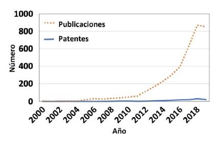 Una respuesta a este interrogante puede obtenerse a partir de la cuantificación de los resultados derivados de investigación en riesgo y toxicidad en la línea de tiempo para Nanol y Nano2. Esta cuantificación se puede correlacionar directamente con el número de publicaciones científicas en revistas de reconocido impacto. Resulta pertinente, además, contrastar estas cifras con la oferta en nanomateriales, los cuales representan la materia prima para la confección de productos y servicios (González, 2014). En la figura 2 se muestra el comportamiento en la ventana de tiempo 2000-2019 para el número de publicaciones científicas referidas a producción y caracterización de nanomateriales, así como en toxicidad y riesgo4.