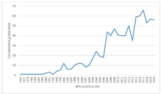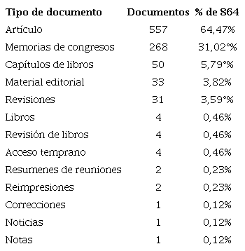 Los resultados han sido un total de 864 documentos publicados hasta el año 2020, cuya distribución en los tipos de documentos se muestra en la tabla 1, en la cual observamos que los artículos en revistas son los más numerosos (64,47%), seguidos de las memorias en congresos (31,02%). De la información obtenida analizamos aquella que nos permite trazar la evolución de las publicaciones y los títulos de los documentos.
