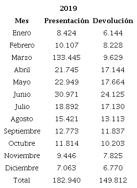 La tabla 2 muestra el número de detenciones y devoluciones realizadas cada mes durante 2019.