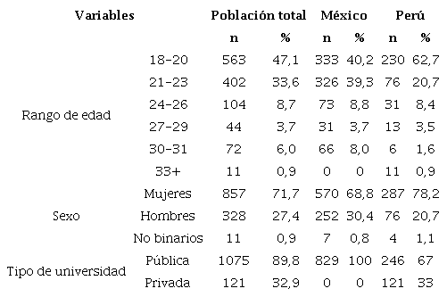 En la tabla 1 se muestran los datos demográficos de edad, sexo y tipo de universidad (pública o privada) de la población de estudio. Todas las universidades se ubican en zonas urbanas.