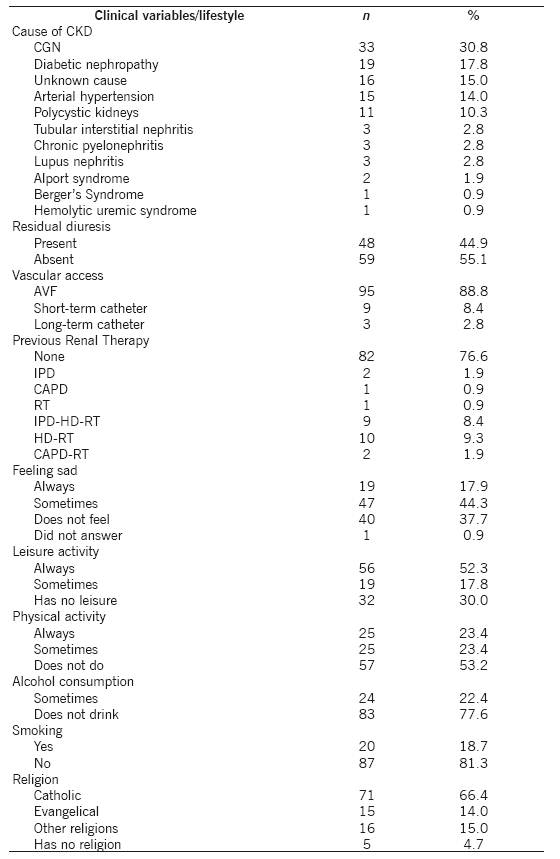 Among the 107 people who participated in this study, 67 (62.6%) were male, aged from 18 to 85 years, with mean age of 51.1 years and standard deviation (SD) of 14.3 years; average schooling of 7.6 years (SD = 4.6 years). The current HD time averaged 4.5 years (SD = 3.6 years), ranging from seven months to 18.6 years. The monthly family income was an average of 5.5 minimum wages (MW) (SD = 5.9 SM), the predominant income range was between one and three MW for 41 (38.3%) people, and the current MW in Brazil, at the time of data collection, was R$ 350.00. Regarding work, 10 (9.3%) people reported having some profitable activity related to work, and 97 (90.7%) people were not working and, of these 74 (76.3%) were retired. Table 1 shows the variables related to clinical conditions and lifestyle of the population studied.