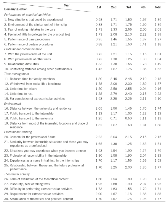 For the data collection, a self-report instrument consisting of two parts was used. The first part contained sociodemographic questions and the second was made up of the questionnaire "Assessment of Stress in Nursing Students" (AEEE),7 consisting of 30 questions/items, grouped into six domains: (1) Performance of practical activities (6 questions); (2) Professional communication (4 questions); (3) Time management (5 questions); (4) Environment (4 questions); (5) Professional training (6 questions); and (6) Theoretical activity (5 questions), in which the answers are organized on a Likert scale of four levels, scored: 0 = "No experience of the situation"; 1 = "I do not feel stressed with the situation"; 2 = "I feel a little stressed with the situation" and; 3 = "I feel very stressed with the situation".7 Data analysis was performed by domains and the means of the response to the AEEE questions, to identify the levels of stress among the students. Thus, for the analysis of the questions, the Weighted Mean (WM) of each question by Course Year was calculated. For assessing the level of stress by domains, the sum of the values of the answers to the questions corresponding to each domain was calculated and then the score was classified according to the values listed in Table 1.