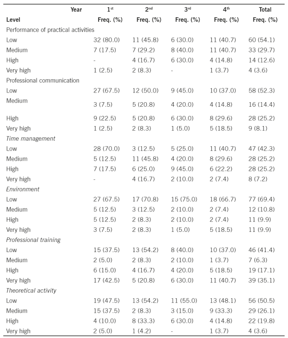 Although other studies2 present time management as a major factor of deterioration among undergraduate nursing students of all years, only those of the third year presented high levels of stress in this domain (high=45%, very high=10%). It is conjectured then, that this fact may be associated with the possible transition that this year in the course represents for the undergraduate students, who must devote themselves exclusively to the specific training in nursing, which is usually associated with a greater amount of practical activities (internships); theoretical work; case studies; and theoretical and practical assessments, which represent common pedagogical tools in this stage.
