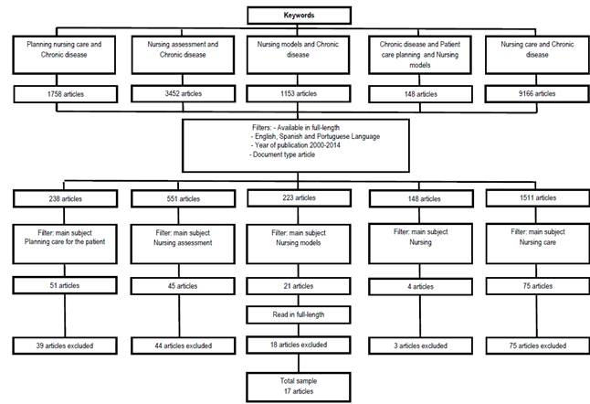 The search took place from May through June 2014, using the following controlled and non-controlled and associated descriptors: "models of care AND chronic disease", "nursing care AND chronic disease", "nursing assessment AND chronic disease", "patient care planning AND chronic disease" and "chronic disease AND patient care planning AND nursing models". This resulted in gathering a total of 15677 articles. Inclusion criteria were: articles available in full-length for free, in Portuguese, English and Spanish, published from 2000 to 2014. This resulted in 2,671 articles, for which the main subject filters were applied, reducing the number to 196 articles. These were submitted to exhaustive reading in full-length, independently, to ensure rigor while selecting those articles contemplating the guiding question. Exclusion criteria were: articles with population or sample composed of children or patients with chronic wounds and articles repeated in different databases. After applying these criteria, 17 articles remained (Figure 1).