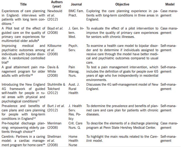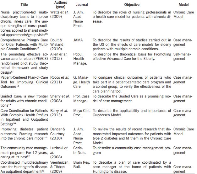 The Chronic Care Model (CCM) and the Innovative Care for Chronic Conditions (ICCC) stand out among models for CD. The first was introduced by a North American Institute in mid-1990 in order to transform care through a combination of elements such as health staff, self-management and decision support, and use of information and recording technologies.4 The ICCC derived from the above was developed by the World Health Organization and is based on the belief that outcomes for chronic conditions are achieved when patients and family members are motivated and informed and health professionals work together.5 These and other models have been created due to the need for changing the management of CD. They have the purpose of determining what actions and practices are adequate, respecting the peculiarities of their care. Thus, it is understood that there are some care concepts that have become part of the health discourse with the increased prevalence of CD worldwide, such as self-care management and case management (case management and operation are used interchangeably). Given the impact of CD and the need for life-long treatment and monitoring, these diseases require a new approach, such as the models of care. Thus, the present study aims to identify care models and their impact in the care of patients with CD published in literature from 2000 to 2014.