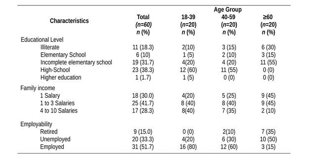 Socioeconomic characteristics. The subjects in this study were divided according to age group, being 20 women aged between 18 and 39 years, 20 between 40 and 59 years and 20 over 60-year old, a total of 60 subjects. Table 1 shows the data for the socioeconomic conditions, such as the educational level, familiar income and conditions in work. Regarding the schooling of the studied population, it was found that for women aged 18 to 39 years and 40 to 59 years, 12 (60%), and 11 (55%) have high-school grade, respectively, and of the 20 women over 60-year old, 11 (55%) have only elementary school. This shows that the lower is the age, the higher the educational level, which may be related to the higher incentive for education and development of the country. On family income, it was verified to be higher in women aged between 18 and 39 years, while in the elderly it is minor, with one to three minimum salaries classification. Regarding employability, most women have employment bond, 16 (80%) between 18 to 39 years, 12 (60%) between 40 to 59 years and women over 60-year old were 10 (50%).