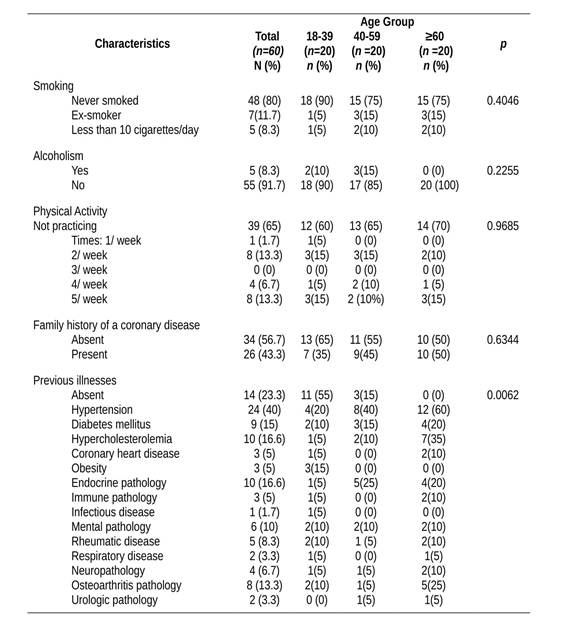 Health indicators and daily habits.Table 2 shows data for health indicators and daily habits, including smoking, alcoholism, physical activity, family history of coronary heart disease and previous illnesses. For smoking, 18 (90%) of the women are aged between 18 to 39 years, 15 (75%) 40 to 59 years and 15 (75%) above 60-year old, have never smoked. With respect to the indicators of alcohol consumption among women from 18 to 39 years, 40 to 59 to 39 years and 60 years or more, 18 (90%), 17 (85%), 20 (100%) reported not consuming alcohol, respectively. In relation to data on physical activity, there was low adhesion of women to physical exercising in all age groups; and 39 (65%) said they do not have this habit. About the family history of coronary heart disease, women were asked if they have already had cases of cardiovascular disease in first-degree relatives (father, mother and/or brother) in their family, as a result, in the age group going from 18 to 39 years and 40 to 59 years, 13 (65%) and 11 (55%) denied owning, respectively. In the age group of women over 60-year old, it was found that 10 (50%) reported coronary heart disease in the family. Also in Table 2, on the indicators of previous diseases, only 14 (23.3%) women denied the existence. The remainder, 46 (76.6%), all had some sort of pre-existing pathology. There is an increase in the pathologies as age increases.