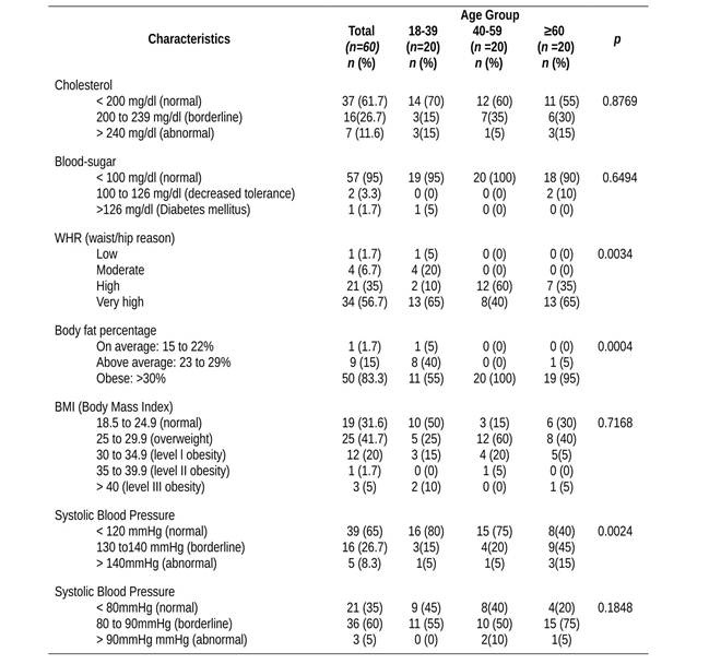 Anthropometric and biological parameters. In Table 3, there are data on cholesterol, blood sugar, WHR, BMI, body fat percentage, and systolic and diastolic blood pressure. In relation to the cholesterol indicators, in all age groups more than half of the women had satisfactory results, but this proportion has decreased as age increased. The results were changed to 6 (30%), 8 (40%) and 9 (45%) between the ages going from 18 to 39 years, 40 to 59 years, and with more than 60-year old, respectively. Being these results concerning for middle-aged women, which resemble to the old ladies. As for the blood sugar, 57 (95%) of women were within normal limits, just 9 interviewees referred a diagnosis for diabetes mellitus, these results suggest that there is a blood sugar control by using pharmacological therapies. Data from BMI, WHR, and body fat percentage (Table 3) were collected in order to measure overweight and obesity. In relation to BMI, normal values were obtained for just 10 (50%) of women aged between 18 to 39 years. Results altered to overweight and obesity, 10 (50%) were from 18 to 39 years, 17 (85%) from 40 to 59 years and 14 (70%) over 60-year old. These results are above the national average and the highest index in women aged from 40 to 59 years.
