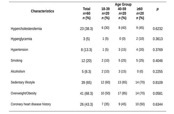Results.: Risk factors were overweight / obesity (63.8%) and sedentary lifestyle (65%), followed by family history of cardiovascular disease (43.3%), hypercholesterolemia (38.3%), and hypertension (13.3%).