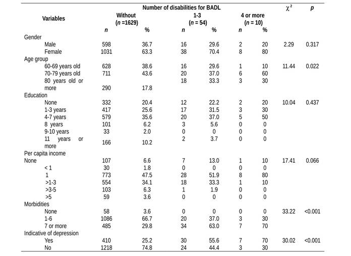 In the three groups, those with 70-79 years old prevailed. However, the proportion of elderly individuals aged 80 years old and over was higher among those with 1-3 and 4 and more disabilities. A higher number of morbidities and the presence of an indication of depression were associated with a greater number of functional disabilities for BADLs among the elderly.