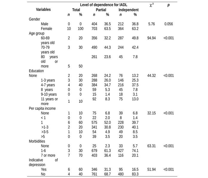 Table 3 shows the level of dependence in the IADL according to socioeconomic variables, the number of morbidities and indicative of depression. In the IADLs, the highest level of dependence was higher among the elderly with 80 years old and over, lower educational level, who received a minimum wage, had seven or more morbidities and had an indicative of depression.